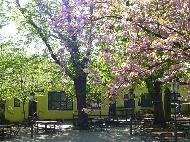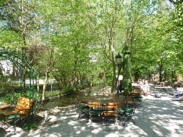 Der gewachsene Biergarten mit seinem hohen Baumbestand, dem kleinen Bach und den zugerankten Lauben war an warmen Sommertagen von Familien gern besucht.