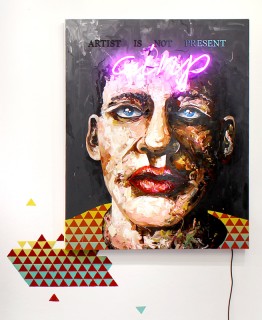 Peintre X hat hier seinen eigenen, einprägsamen Ausdruck gefunden. Seine Interpretationen des Bildnisses sind verschleiernd und überspitzend zugleich. Die dargestellten Personen haben Masken oder Hüte auf, sind mal mit verschlüsselten Typografien versehen oder stehen einfach Kopf. Die Wirkung seiner Werke ist gleich in doppelter Hinsicht emotional erfahrbar – durch Form und Farbe sowie durch das figurativ Dargestellte an sich. Die bewegt ausgeführte Pinselführung, deren pastoser Farbauftrag die Kraft der Materie heraufbeschwört, hier und da durchzogen von Akzente setzenden, zeichnerischen Elementen, die nahezu expressionistisch kontrastierende Wucht der Farbwelten, der Ausdruck des Blickes der dargestellten Gesichter – all das trägt zu einem inneren Erleben der Bildnisse bei. Gleichzeitig vollzieht sich trotz Zitatenreichtum und Bezügen zu menschlichen Empfindungen ein entfremdender Abstand zur Realität mittels einer leichten perspektivischen Verzerrung.
