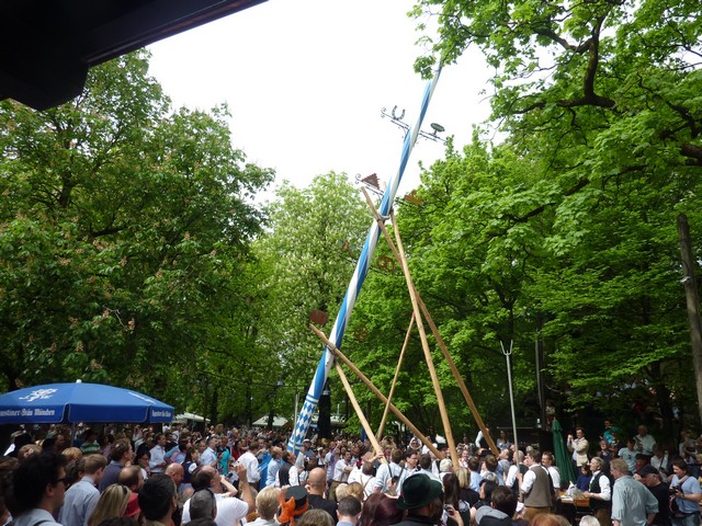 Traditionelles Aufstellen des Maibaumes im Biergarten des Augustinerkellers